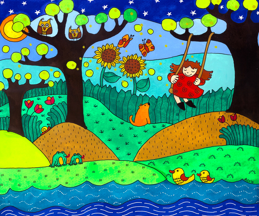 In this illustration I painted a girl who is enjoying swinging from a branch. She is surrounded by different animals. There are two ducks, two frogs, two owls, two butterflies, and even two sunflowers. They each have a partner to share their experience with, whether that’s swimming, catching flies, enjoying the breeze, or taking a pause to observe the world around them. As she tries to swing high up into the air, the dog gazes upon her with marvel. He wonders, how does it feel to experience swinging like this. He wishes he could do the same and join her on the swing, but he knows he can’t. So he waits. Maybe eventually she will join him for a stroll by the lake and they can find a common ground to walk on side by side.